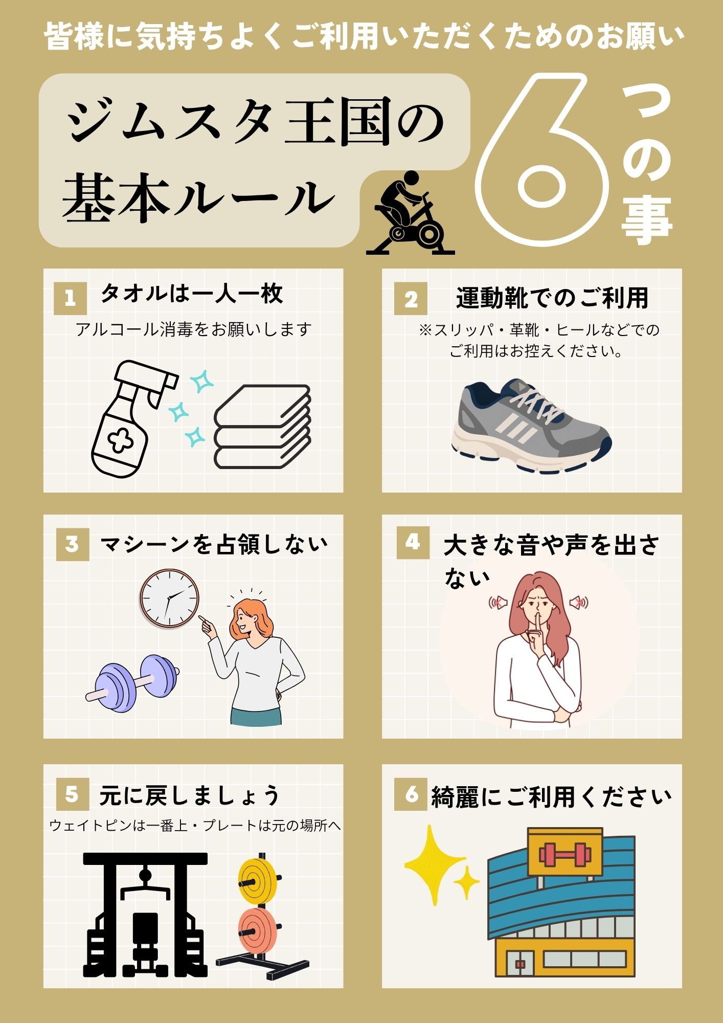 この度、ご利用者様の増加に伴い、より多くの皆さまに快適にご利用いただくため、ジムのルールを下記の通り明確化致しました。